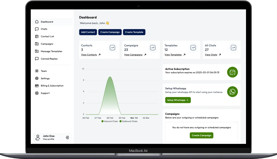 Once logged in, you’ll access your dashboard where you can view available chats, send messages, create templates, set up campaigns, and build automations.